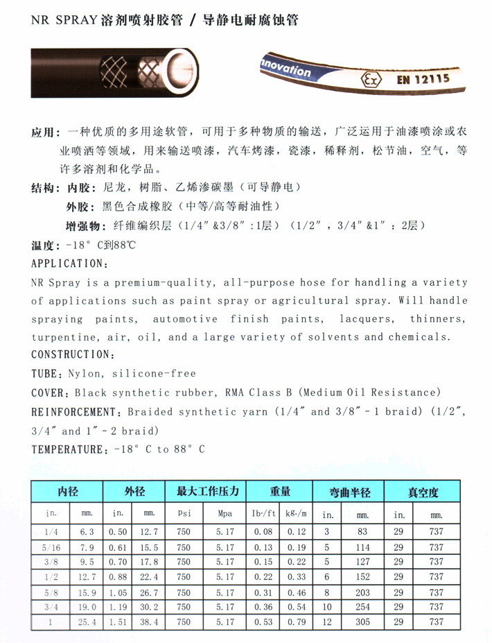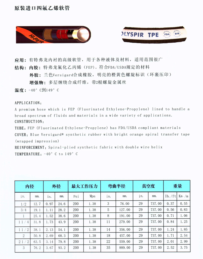 技術(shù)參數(shù) ◆透明耐腐蝕軟管 ◆規(guī)格:7.5X10.5、95X13、6X9、8X10 ◆內(nèi)層:特氟隆(PTFE塑料王)。 ◆外皮表層:平滑、透明。 ◆工作壓力:0BAR(0PSI)-5BAR(60PSI) ◆工作溫度:-5攝氏度-50攝氏度。 ◆應(yīng)用于各種化學(xué)原料和溶劑,如甲苯、環(huán)己酮、油漆、溶劑石腦油、丙酮等。 |