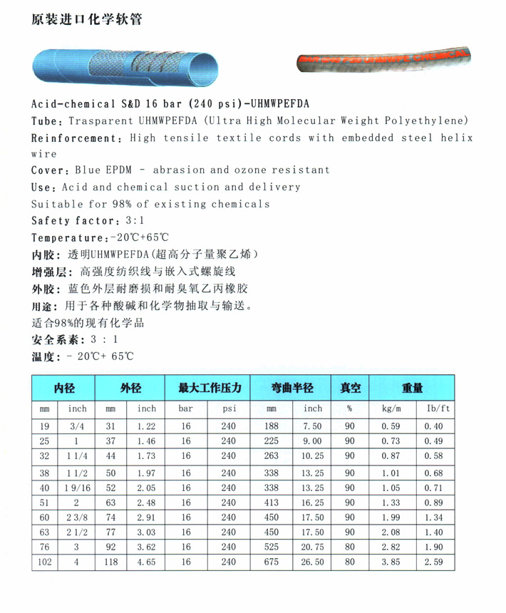 導(dǎo)電型化工軟管技術(shù)參數(shù) ◆耐強(qiáng)腐蝕化工軟管,耐溶劑軟管 ◆口徑:3/4寸、1寸、1-1/4寸、1-1/2寸、2寸、2-1/2寸、3寸、4寸 ◆內(nèi)層:導(dǎo)電UHMWPE ◆加強(qiáng)層:高抗拉編織絲加上纏繞鋼絲(藍(lán)色、黑色)。 ◆外皮表層:抗磨損和臭氧的合成橡膠,亦具有阻火性。 ◆工作壓力:16BAR(240PSI) ◆應(yīng)用于酸、化學(xué)藥品、各種易燃燒溶劑輸送,適用于市場(chǎng)上98%的化學(xué)材料輸送。 |